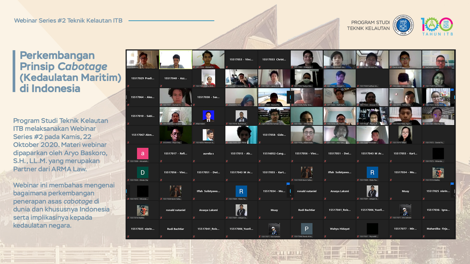 Kamis, 22 Oktober 2020 Mata kuliah KL4101 Etika Profesi dan Isu Kontemporer Bidang Teknik Kelautan, Program Studi Teknik Kelautan ITB, mengadakan Webinar dengan judul “Perkembangan Prinsip Cabotage (Kedaulatan Maritim) di Indonesia” yang mengundang Aryo Baskoro, S.H., LL.M. yang merupakan Partner dari ARMA Law. Webinar ini dilaksanakan secara daring dan terbuka bagi seluruh mahasiswa ITB yang berminat untuk menambah wawasan mengenai materi yang akan didiskusikan bersama narasumber.